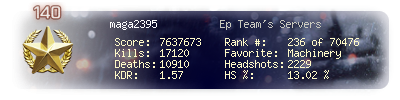 | Headshots | 2487 | Suicides | 151 | Headshot / Kill | 12.73 % |