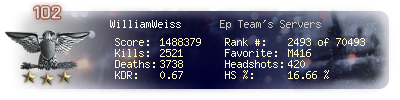 | Headshots | 688 | Suicides | 13 | Headshot / Kill | 18.61 % |