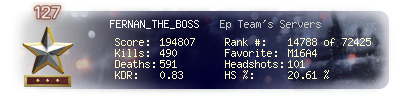 | Headshots | 101 | Suicides | 3 | Headshot / Kill | 20.61 % |