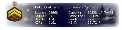 | Headshots | 8 | Suicides | 0 | Headshot / Kill | 27.59 % |