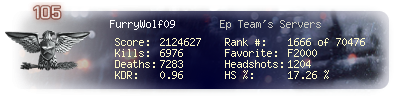 | Headshots | 1204 | Suicides | 91 | Headshot / Kill | 17.26 % |