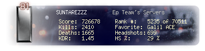 | Headshots | 699 | Suicides | 11 | Headshot / Kill | 29 % |