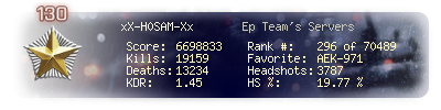 | Headshots | 3787 | Suicides | 90 | Headshot / Kill | 19.77 % |