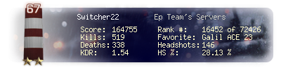| Headshots | 146 | Suicides | 6 | Headshot / Kill | 28.13 % |