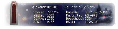 | Headshots | 355 | Suicides | 36 | Headshot / Kill | 19.07 % |