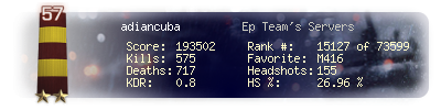 | Headshots | 155 | Suicides | 8 | Headshot / Kill | 26.96 % |