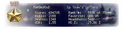 | Headshots | 540 | Suicides | 12 | Headshot / Kill | 25.86 % |