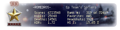 | Headshots | 3921 | Suicides | 113 | Headshot / Kill | 15.65 % |