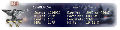 | Headshots | 432 | Suicides | 6 | Headshot / Kill | 19.53 % |