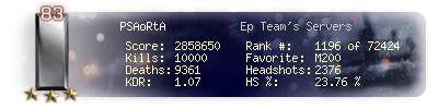 | Headshots | 2376 | Suicides | 117 | Headshot / Kill | 23.76 % |