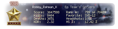 | Headshots | 661 | Suicides | 36 | Headshot / Kill | 11.41 % |