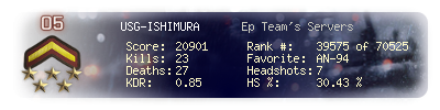 | Headshots | 7 | Suicides | 1 | Headshot / Kill | 30.43 % |