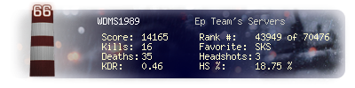 | Headshots | 3 | Suicides | 1 | Headshot / Kill | 18.75 % |