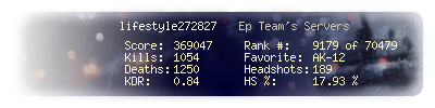 | Headshots | 189 | Suicides | 4 | Headshot / Kill | 17.93 % |