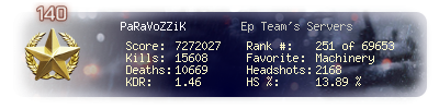 | Kills | 15608 | Deaths | 10669 | Kill / Death | 1.46 |