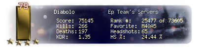 | Headshots | 8 | Suicides | 3 | Headshot / Kill | 10.96 % |