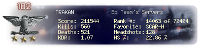 | Headshots | 128 | Suicides | 3 | Headshot / Kill | 22.86 % |