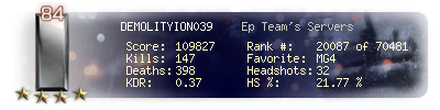 | Kills | 147 | Deaths | 398 | Kill / Death | 0.37 |