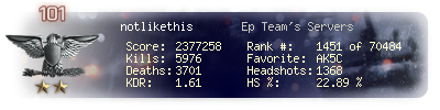 | Kills | 5976 | Deaths | 3701 | Kill / Death | 1.61 |