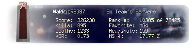 | Headshots | 159 | Suicides | 16 | Headshot / Kill | 17.77 % |