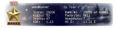 | Headshots | 7 | Suicides | 2 | Headshot / Kill | 13.21 % |