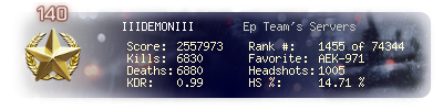 | Headshots | 1005 | Suicides | 54 | Headshot / Kill | 14.71 % |