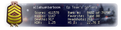 | Headshots | 261 | Suicides | 7 | Headshot / Kill | 22.76 % |