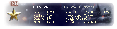 | Headshots | 97 | Suicides | 19 | Headshot / Kill | 22.56 % |