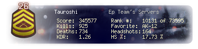 | Headshots | 164 | Suicides | 5 | Headshot / Kill | 17.73 % |