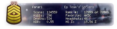 | Headshots | 46 | Suicides | 7 | Headshot / Kill | 15.54 % |
