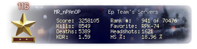 | Headshots | 450 | Suicides | 20 | Headshot / Kill | 16.15 % |