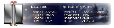 | Kills | 10099 | Deaths | 8096 | Kill / Death | 1.25 |