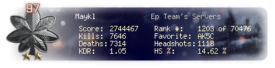 | Headshots | 1118 | Suicides | 99 | Headshot / Kill | 14.62 % |