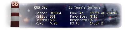 | Headshots | 97 | Suicides | 4 | Headshot / Kill | 14.67 % |