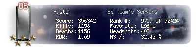 | Headshots | 127 | Suicides | 26 | Headshot / Kill | 32.99 % |
