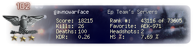 | Kills | 26 | Deaths | 100 | Kill / Death | 0.26 |