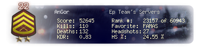 | Headshots | 27 | Suicides | 3 | Headshot / Kill | 24.55 % |