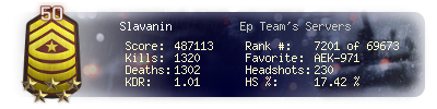 | Headshots | 230 | Suicides | 9 | Headshot / Kill | 17.42 % |
