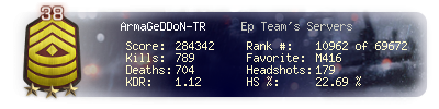 | Headshots | 62 | Suicides | 6 | Headshot / Kill | 19.5 % |