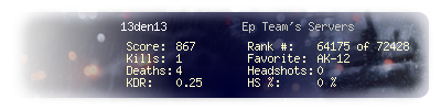 | Headshots | 0 | Suicides | 0 | Headshot / Kill | 0 % |