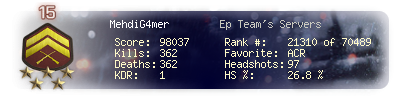 | Headshots | 97 | Suicides | 5 | Headshot / Kill | 26.8 % |