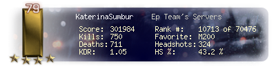 | Headshots | 324 | Suicides | 6 | Headshot / Kill | 43.2 % |