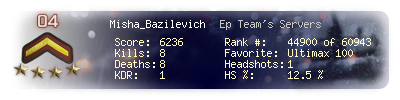 | Headshots | 1 | Suicides | 0 | Headshot / Kill | 12.5 % |