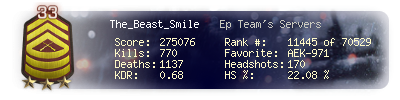 | Headshots | 170 | Suicides | 12 | Headshot / Kill | 22.08 % |