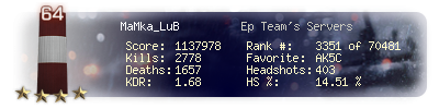 | Kills | 2778 | Deaths | 1657 | Kill / Death | 1.68 |