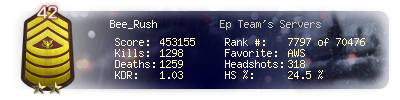 | Headshots | 115 | Suicides | 6 | Headshot / Kill | 26.56 % |