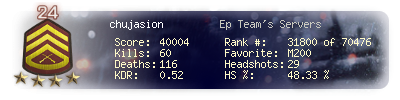 | Kill-streak | 4 | Death-streak | 21 | Team Kills | 0 |