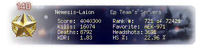 | Kills | 16074 | Deaths | 8792 | Kill / Death | 1.83 |