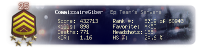 | Headshots | 185 | Suicides | 4 | Headshot / Kill | 20.6 % |