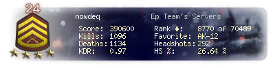| Headshots | 292 | Suicides | 18 | Headshot / Kill | 26.64 % |